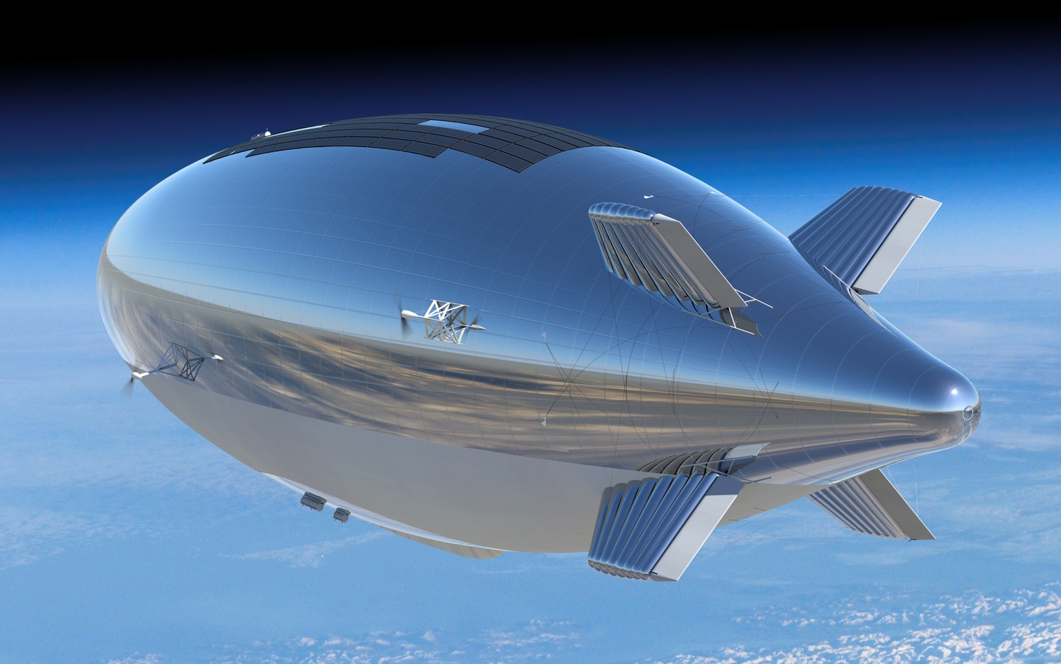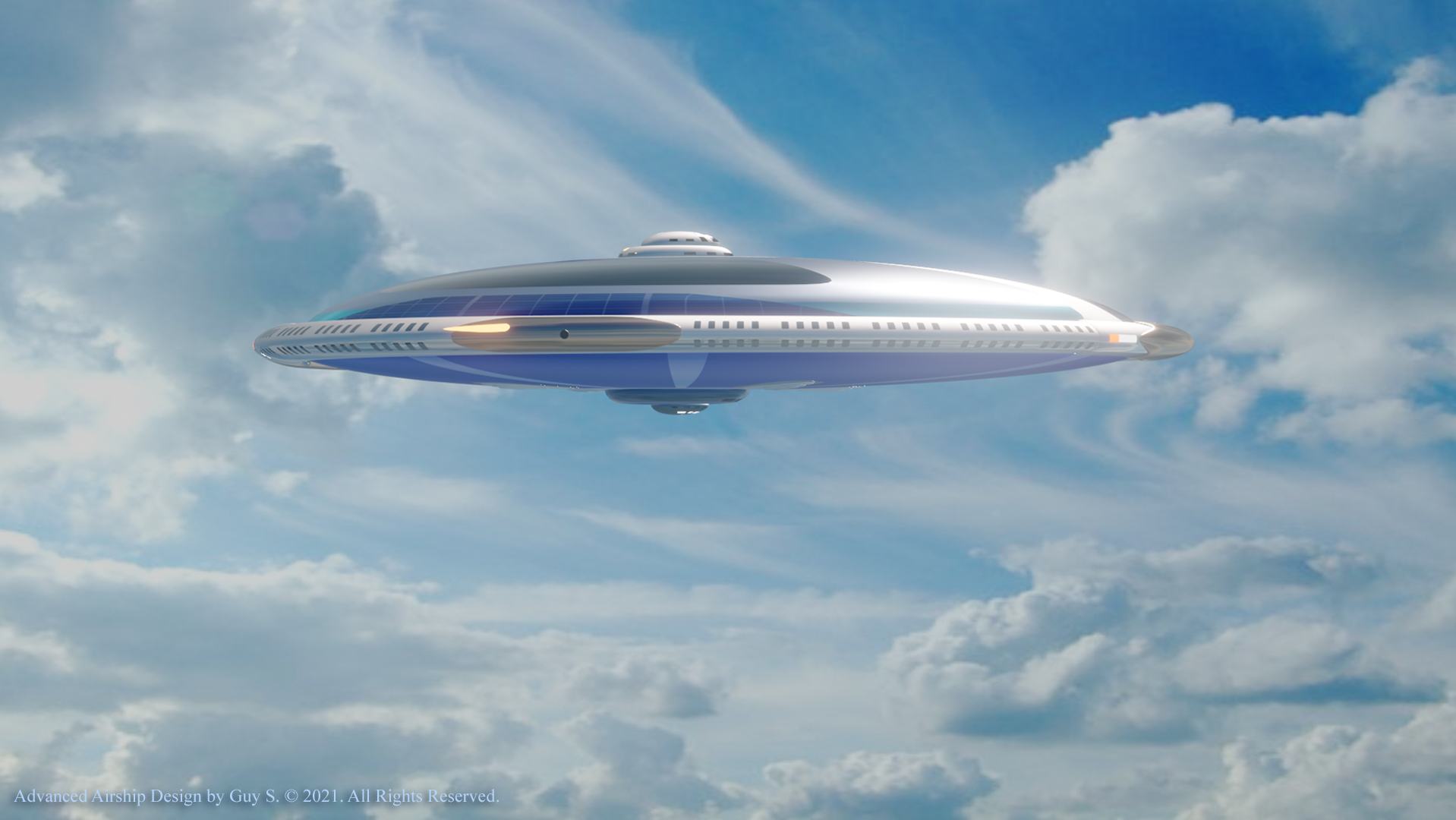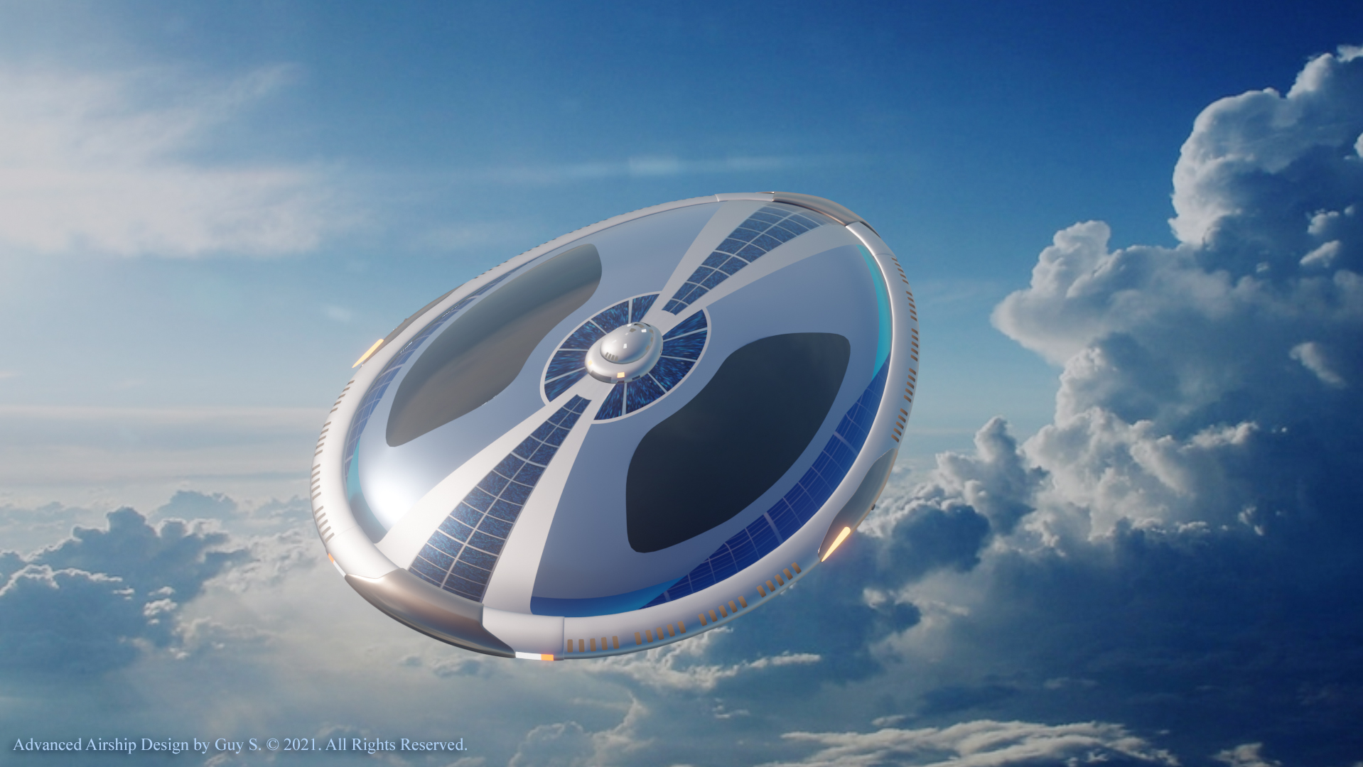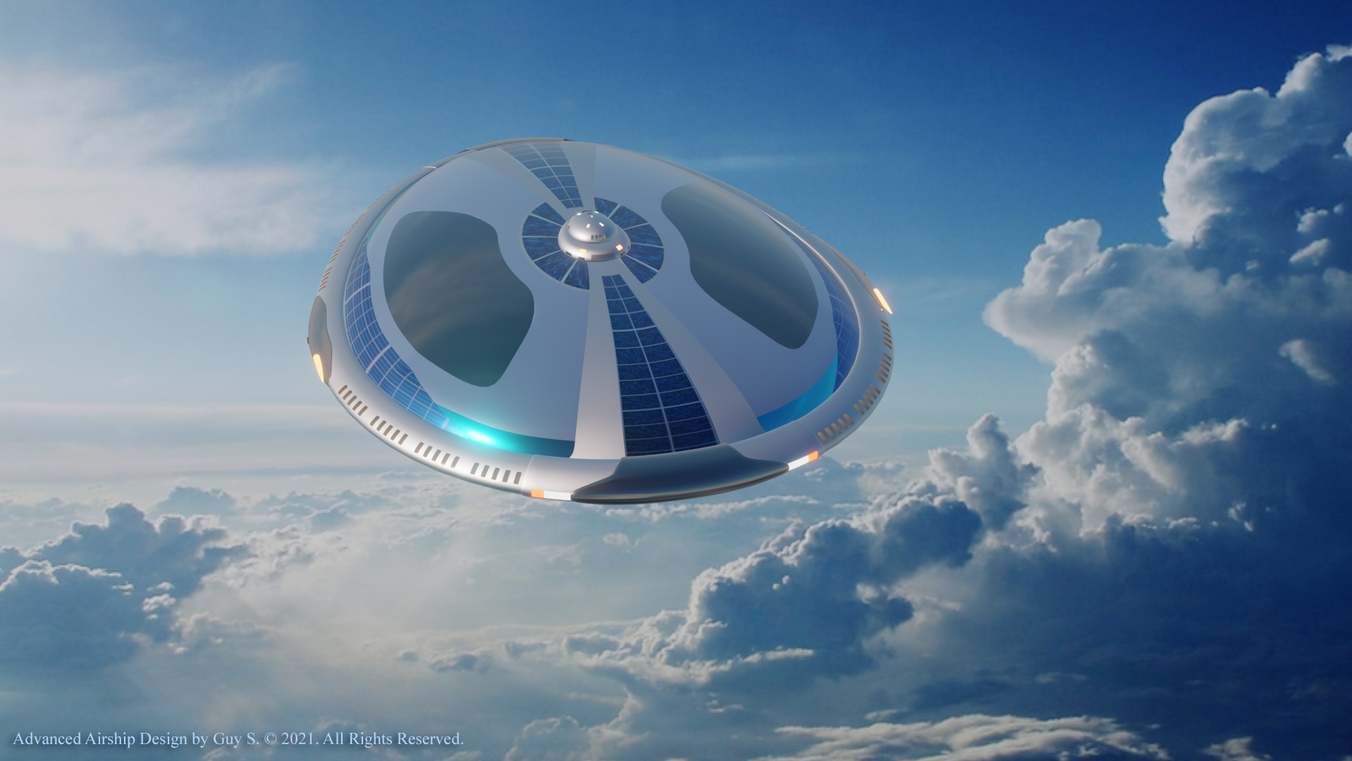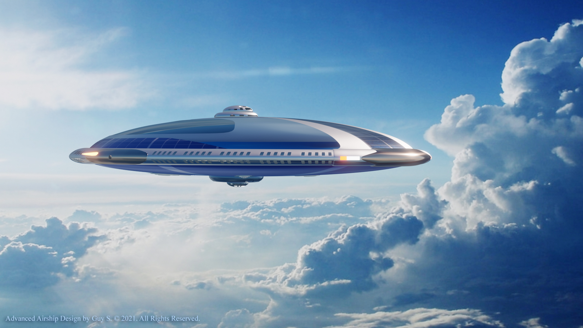 Surprisingly, I had never seen airships using solar panels. I thought it was such a waste not to take advantage of all that surface area, which was perfect for such a thing.  The closest thing I had ever seen to it were those array of lights that are often draped over the outer membrane of a blimp to create low resolution text and image displays—mainly for advertising purposes. Most space crafts are always struggling to find any usable surface area to place solar panels on and so usually end up attaching them like flags or hanging them from wires on modern balloons and airships. But after a couple of decades went by, I finally started seeing airship concept designs where solar panels were being used in this way. This was another idea that I wondered whether or not was practical or realistic. Apparently, modern airship builders think it is, which helped me to feel validated once again. I would also like to incorporate hydrogen fuel cells to help generate electrical power during times when there isn’t adequate sunlight, such as during overcast days or at night, along with batteries in rare cases electrical power can’t be generated.