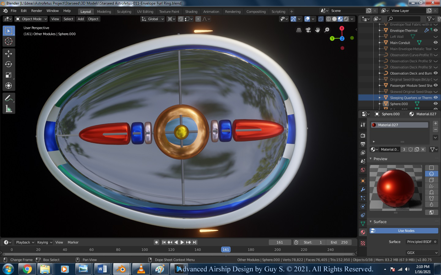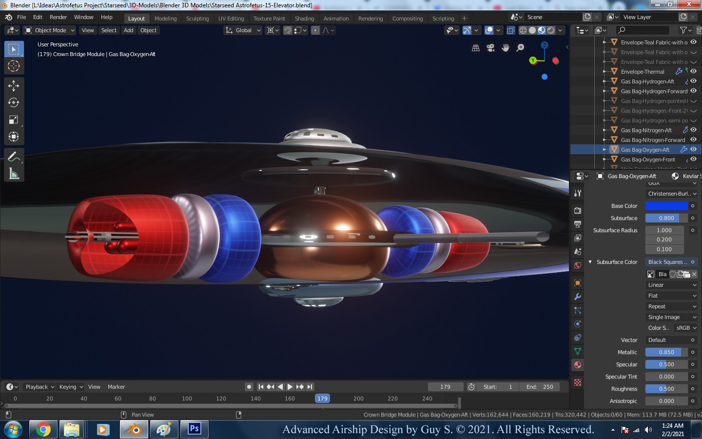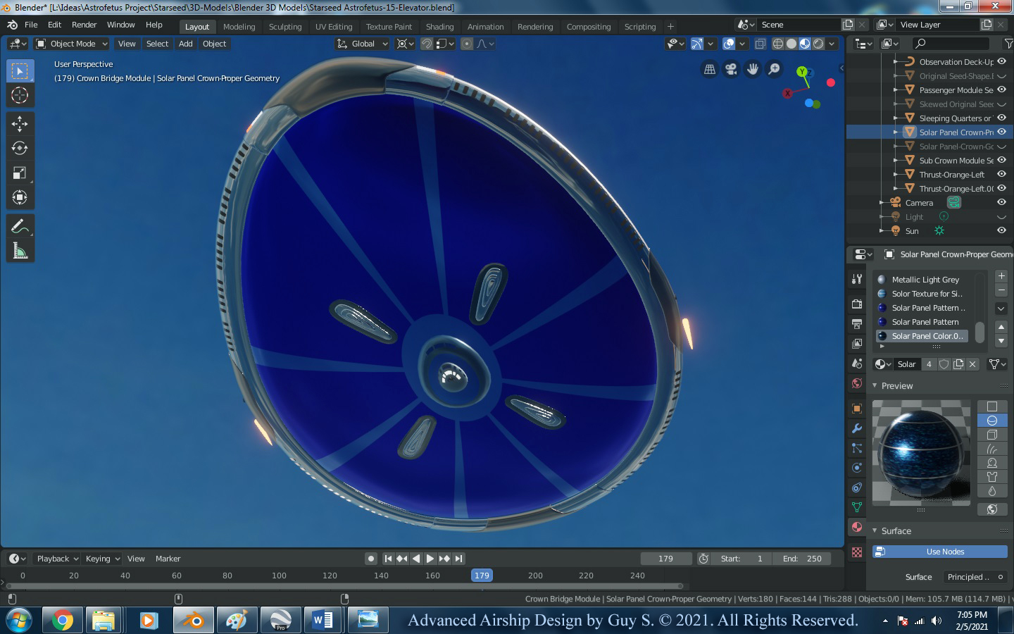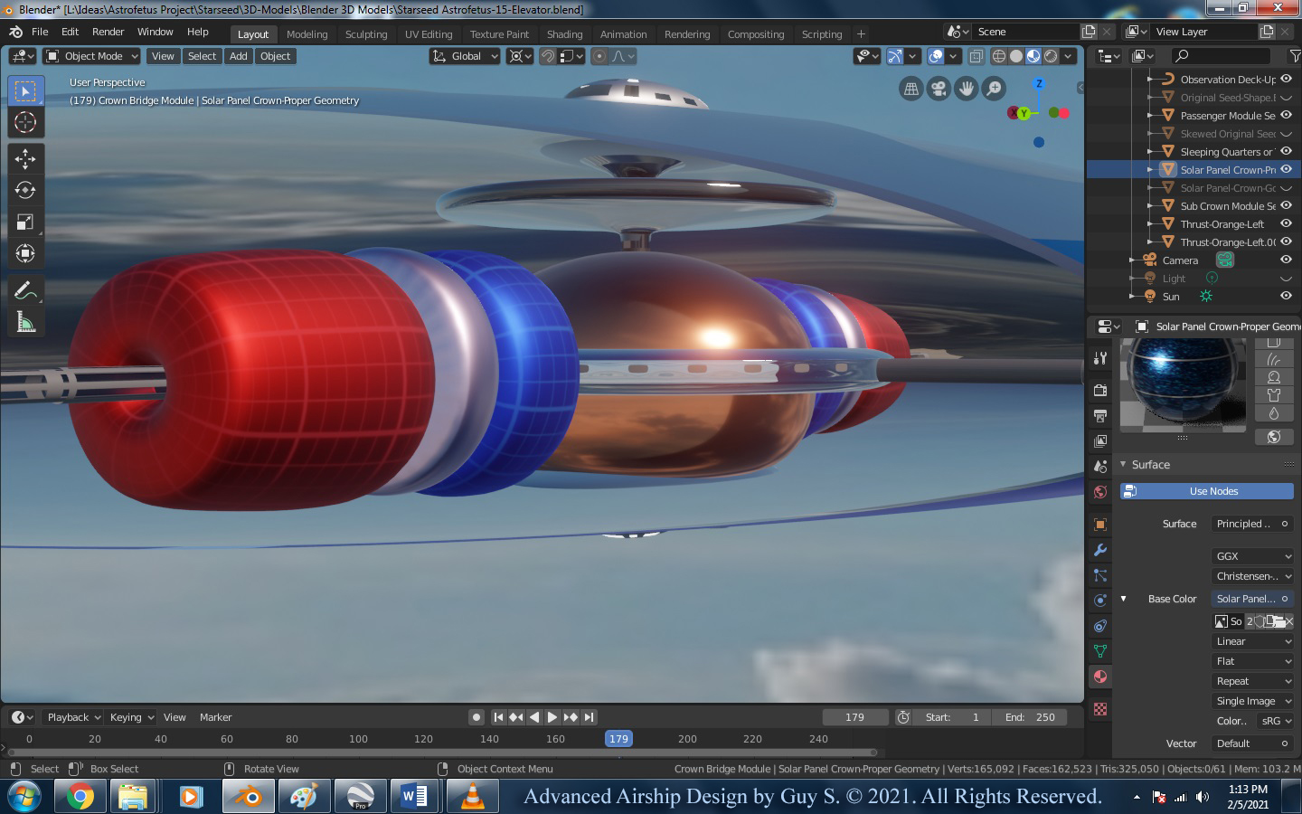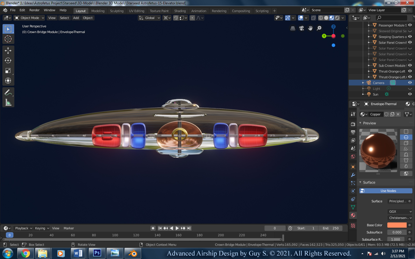 Early on, I would design my airships so that many of the smaller inner envelopes were made either partly or entirely out of solar panel materials in order to generate electrical power for the ship and its operations, which meant my outer most envelope would remain somewhat transparent, so the Sun’s rays could reach those inner solar cells (I’m sure covering the entire outer envelope with solar panels would prove to be too heavy). In my latest designs, the outermost, thinnest envelope is a metallic looking, highly reflective, Mylor-type membrane, so as to prevent the Sun from heating up the inner gases. The temperature of the main lifting gas and all other onboard gases should be primarily controlled and managed by those flying the airship using internal lamps and heating coils and/or microwaves. So thin, lightweight, solar panels would be placed on the outer most envelope around the thruster bays (not covering the entire airship).