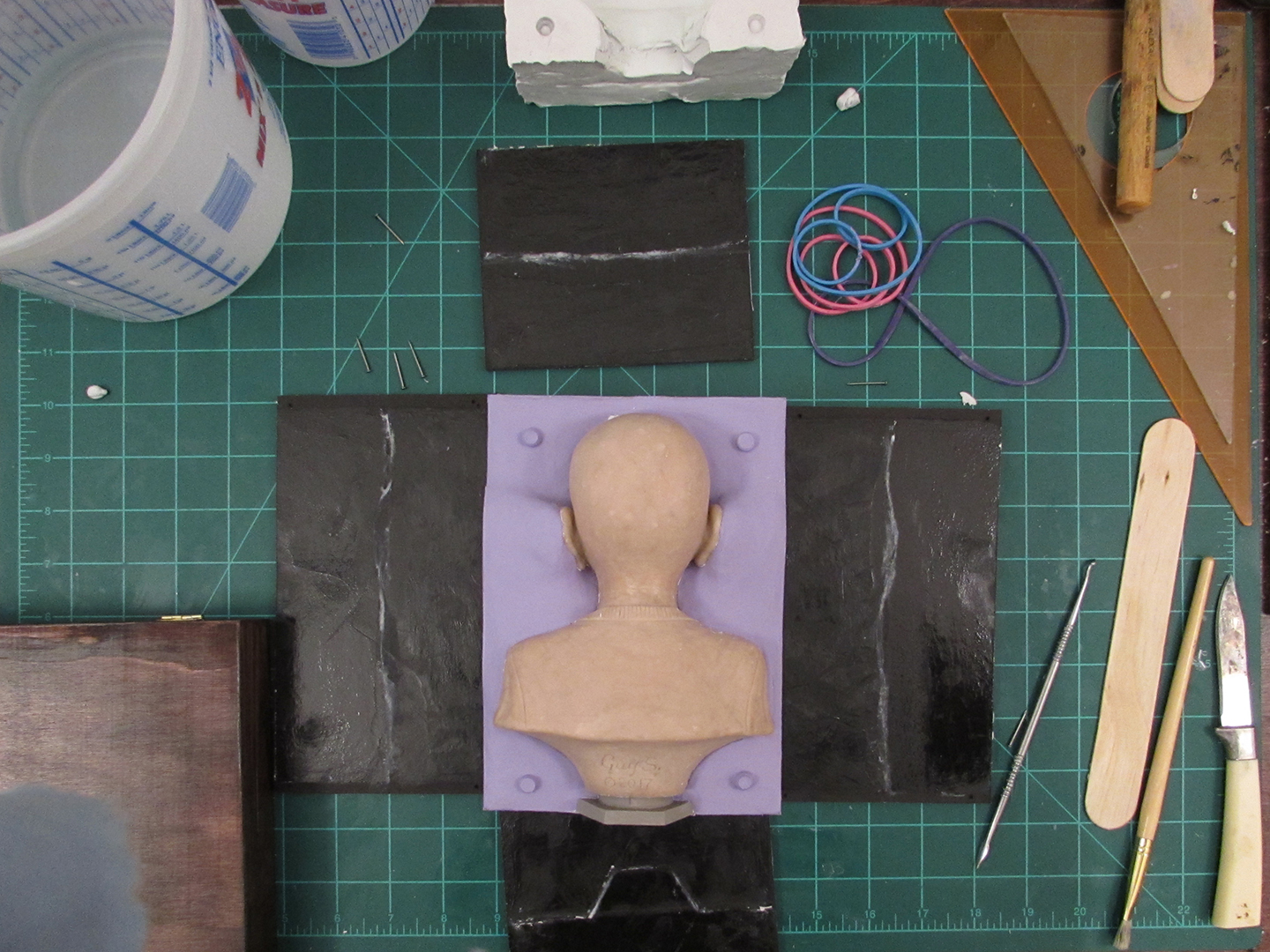 I measured and cut out pieces of black foam board and used a hot glue gun to construct a vertical container, so I could pour in a 2-part silicone mixture called Oomoo 30 to form a mold of the original sculpted head bust of Johnnie, which I placed inside (I have video clips of all this which I’m sure I’ll turn into a YouTube video some day in the not too distant future).