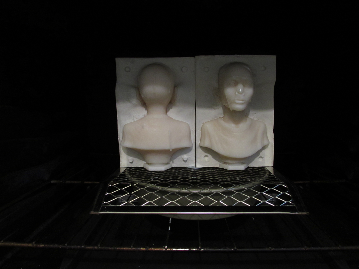 These next set of pictures show some of the time I spent learning to cast different types of waxes as well as creating plaster molds for a deluxe silicone version of Johnnie’s head bust; first using Plaster of Paris and then using Pottery Plaster, which is a better grade for creating fine detailed molds. I still haven’t quite perfected the technique but I’m getting there. You’ll see in the last two pics that I was heating them in an oven to melt out the wax figures, known as a “lost wax” process (the wax figures can’t be pulled from their plaster molds without breaking them due to the fact that both materials are rigid).
