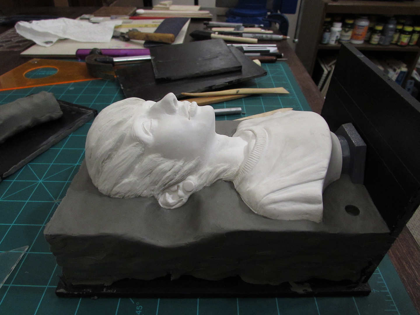 Next is a good side view of my work table, while I worked on sculpting the tiny details of his left ear.